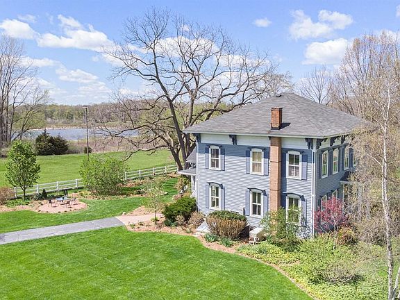 Offers due Tuesday, May 25th by 4:00pm. Gorgeously restored Italianate farm home on verdant 38 acres just minutes from town. Beautiful rolling acreage complete with fishing lake, barn and corn crib, pasture and farmed crops. Previously used for sheep, the barn and acreage are perfect for livestock or working horse farm. Large overhanging eaves with intricate corbels and charming side portico, this former Dancer family residence features all of the charms and details of the Italianate style, but with modern conveniences including 2 natural gas furnaces for zoned heat, central AC throughout and modern appliances. 10-foot ceilings on both levels with wide plank wood floors and detailed moldings throughout. Kitchen includes original hutch and brick hearth which now hosts the gas range. Formal dining room with French doors, spacious living room and study, family room with gas fireplace, and 1st floor laundry. Ascend the staircase to the primary bedroom suite with custom cabinetry and walk-in shower, 3 more ample bedrooms with storage galore. Third floor pull-down attic space with flooring. Beautifully preserved basement with parched stone walls. Original milk house once housed chickens and is now a beautiful shed.