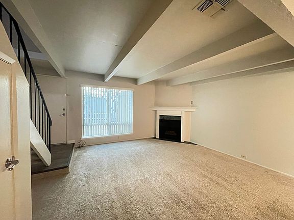 This beautifully refreshed and extra spacious two-bedroom, one-and-a-half bathroom townhouse-style apartment blends charm, comfort, and modern updates. The spacious bedrooms upstairs have plush carpeting, while the living room features a cozy fireplace. Central heating and air, a private patio/backyard, and on-site laundry add to the everyday convenience of this pet-friendly home. Inside, you'll find golden wheat hued carpeting, and warm custom paint colors. The home has been further rejuvenated with updated lighting, and thoughtful finishes throughout.