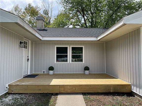 Completely renovated inside and out! This stunning ranch boasts modern fixtures and fresh updates throughout starting with the picture perfect curb appeal highlighted by a new wood deck. Once inside you'll instantly fall in love with the spacious living room featuring rustic wood ceiling beams, stylish light fixture, gorgeous brick fireplace and access to the backyard. The modern eat-in kitchen offers clean white cabinetry, quartz counters, tile backsplash, and stainless appliances. Just off the separate laundry room is a convenient guest half bath. Down the hall you'll discover three large bedrooms, each with fantastic closet space including the primary featuring a private full bath with an incredible walk-in tile shower. Your private oasis awaits out on the new back deck overlooking the fenced yard with plenty of shade trees! Schedule your private showing of this beautiful home today!