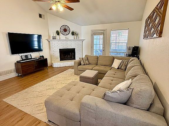 Gas fireplaceLarge fenced yardCovered ramadaBright sunny kitchenVaulted ceilingsBar topBreakfast nook
