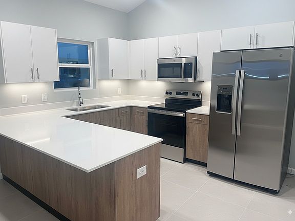 Modern open-concept kitchen equipped with stainless steel appliances (refrigerator, stove, microwave)