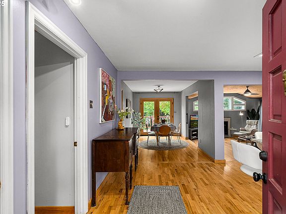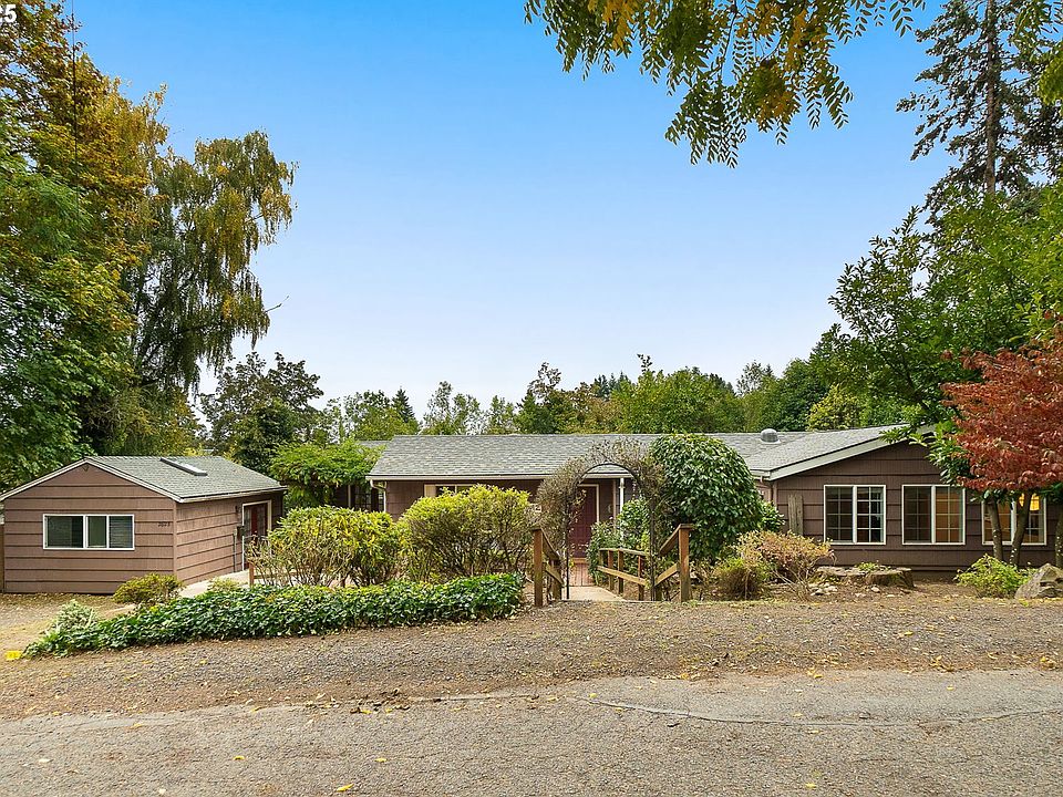 One level living in Multnomah Village! Sunken living room with vaulted wood ceiling and gas fireplace. Dining room has French doors flowing to deck. Updated kitchen with island, skylight and pantry/prep/wet bar area. Wood floors throughout. Two of three bedrooms in main home feature ensuite bathrooms and French doors to exterior. Laundry area with sink. Detached 300 square foot ADU studio rents for $1,400/month, with wood floors, vaulted wood ceilings, skylights, fully equipped kitchen with gas range, dishwasher and microwave; laundry in unit. Lush private garden with decks and swim spa on large lot. Room for additional ADU. Five blocks from Multnomah Village shops, restaurants and bus lines. Mere blocks to Safeway and Fred Meyer. Less than a mile to Gabriel Park. Easy access to Highway 99 and I-5. *ADU bathroom, bedroom and SqFt included in total* [Home Energy Score = 2. HES Report at https://rpt.greenbuildingregistry.com/hes/OR10242276]