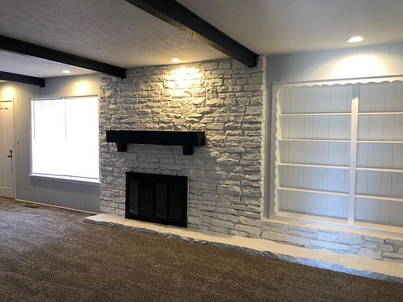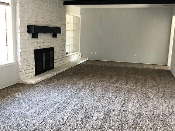 Large main living area with new carpet, wood-burning fireplace, and built-in bookshelves