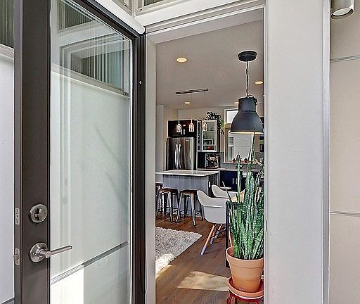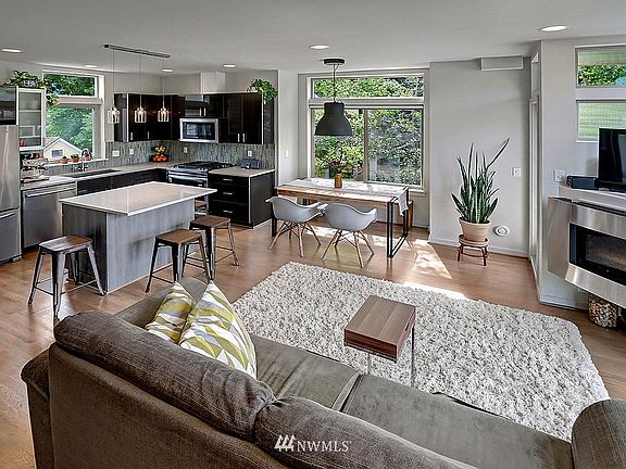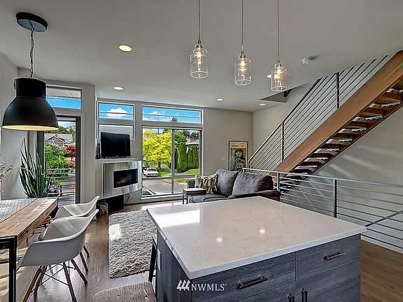 This stunning modern town home has been perfectly maintained to live like new. Natural light abounds throughout the open well designed floor plan. High quality finishes, hardwood floors, quartz counters and a striking floating staircase with custom steel railings. Enjoy scenic city views from a spacious upper view deck with wet bar. 1 car parking pad and no HOD's. Energy efficient, certified 4-Star Built Green. So close to hot, hip downtown Ballard, your convenient urban lifestyle begins here!