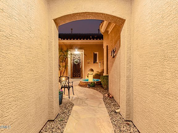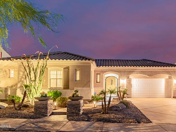Beautiful single story with a sparkling blue pool with waterfall and a Mountain View. This home offers modern multi-generational living with a guest suite with its own separate living area. Chef's kitchen features large extended island, gas stove, seemingly endless storage, an eat-in breakfast nook and beautiful granite. Large primary bedroom has patio access, en-suite bathroom, enormous walk-in closet, and three separate bathroom areas for getting ready. Additional bedrooms are above average size and have separate entry access door from private courtyard. Light bright floor plan with diagonally set tile. Stellar location across the street from everything fun in Tramonto, basketball, tennis, pool, hot tub, picnic area, sand volleyball and playground. Close to TSMC! Walk to restaurants! A/Cs only 3 years old! Also, ask about the excellent solar lease. $178.06 per month and APS in May of 2023 $25.00.