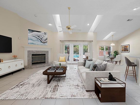 Nestled amidst lush, mature landscaping, this three bed, two bath, all-brick executive home offers a perfect blend of comfort and functionality. As you step inside, you are greeted by an abundance of natural light pouring through oversized windows, french doors, and multiple skylights set into the dramatic cathedral ceilings. The entire home features neutral-colored, low-maintenance tile flooring. The expansive living room is anchored by a beautiful fireplace. Adjacent, a formal dining space awaits your next dinner party, while the dedicated home office provides a productive retreat. The kitchen offers extensive countertops, abundant cabinetry, and an oversized pantry, an ideal space for cooking weeknight meals or prepping for holiday gatherings. A large utility and laundry room adds to the home's practicality. This split floorplan was designed for maximal privacy. The primary bedroom features elegant tray ceilings, large windows overlooking the pool, and a private entrance. The ensuite primary bath is complete with a double vanity, a jetted soaking tub, a separate walk-in shower, and a private water closet. The oversized guest rooms are equally impressive, featuring high ceilings and built-in storage. A well-appointed Jack and Jill bathroom connects the rooms, offering both convenience, space, and style. The outdoor space is a showstopper. Your private backyard oasis features a sparkling, heated inground pool and spa, anchored by a spacious covered lanai. The perfect space for relaxing and entertaining year-round. For the hobbyist or traveler, this property is a dream come true. In addition to an attached oversized two-car garage, a 46' x 18' detached garage with 16-foot ceilings provides secure, covered storage for a Class A motorhome, boat, or car collection. Peace of mind is included with major recent updates: Roof (2023), HVAC (2021), and Water Heater (2025). This is more than a house—it's the lifestyle you've been searching for. Schedule your tour today!