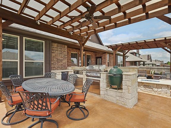 Floor-to-ceiling stone fireplaceOutdoor kitchenStainless-steel appliancesGlass-stone fire pitBuilt-in deskBackyard retreatBonus room