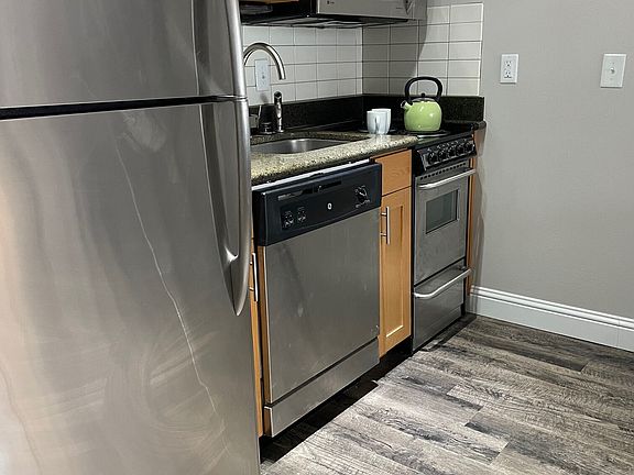 Modern kitchenWood flooringPlush carpetGranite countertopsBaseboard heatingStainless-steel appliances