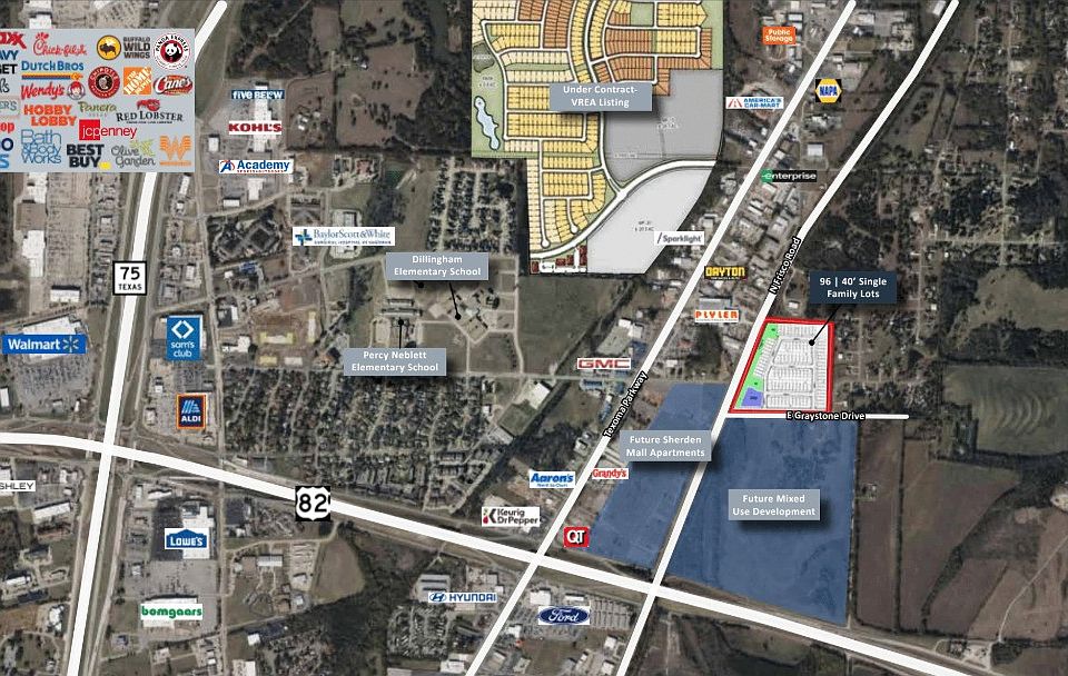 Vanguard Real Estate Advisors (“VREA”) has been exclusively retained by Ownership to present qualified builders and developers with the opportunity to purchase 96 engineered 40-foot paper lots (19.95+- acres) located at 2615 Graystone Drive in Sherman, TX (“the Site”). The Site is centrally located within the Sherman-Denison MSA, less than 1.5 miles east of US Highway 75, less than a 10-minute drive to downtown Sherman, and less than 8 miles north of both the new GlobiTech and Texas Instruments facilities. This represents a great opportunity to acquire a fully engineered single family lot opportunity at an attractive price of only $18,500 per paper lot.