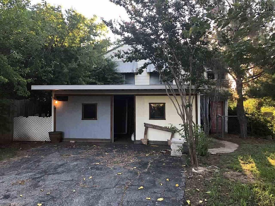 AS-IS investor special. Looking for an investment property to add to your portfolio? This 2 bedroom 1 and a half bath home could make a great duplex with an outdoor stairwell, kitchen and kitchenette, and 2 car covered parking. Sits on a large corner lot masked for privacy by trees and fencing around the property. A little TLC on the inside could make this house a home again!