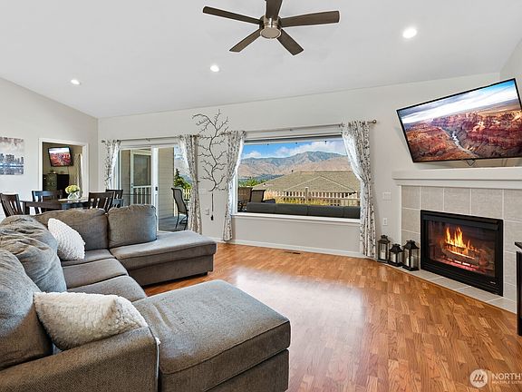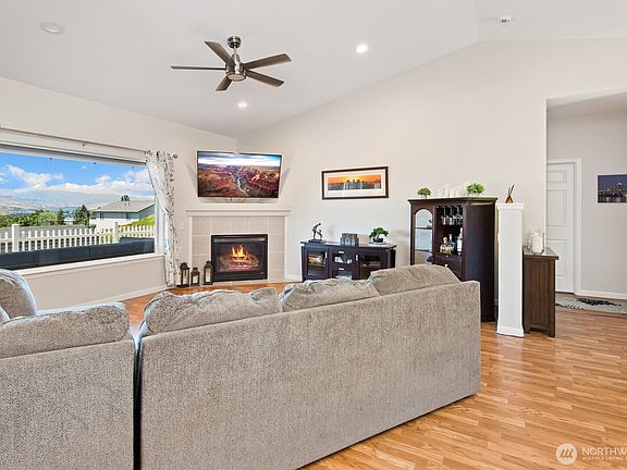 Beautiful custom one level home with amazing views of mountains, city lights & Mission Ridge. Watch sunsets & fireworks from patio, great room & primary bedroom. Large great room with gas fireplace for cozy evenings. Large custom kitchen & supersized laundry room with gorgeous countertops. Primary suite with walk-in organized closet, bath has new countertop, toilets, tile and new paint through the whole house. Large 1100 sq ft garage with space for RV, boat and more. Home is handicap accessible wide halls and doorways. Nice patios on both sides of house for morning and evening sun or shade. Irrigation water for the gardener. Lots of parking. No HOA! Mortgage savings may be available for buyers of this listing.