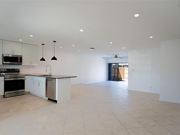 New blindsQuartz countertopsLight and brightNeutral tile floorsOutside fenced patioStainless steel appliancesWhite cabinets