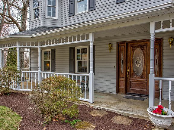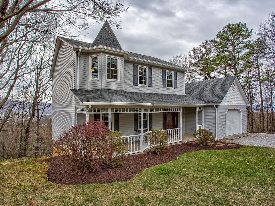 This custom built home offers 4 bedrooms and 2.5 baths within just over 2,700 square feet of living space. The second, and current, owners of this home focused on incorporating the amazing surrounding views of the valley into the home by adding several large picture windows in the entry, upper, and lower levels. An inviting and large covered front porch along with Victorian design elements immediately convey a sense of charm, affording a perfect place to unwind and enjoy the quiet, wooded, and established neighborhood. Enter the home into the foyer with coat closet and powder room, and proceed to the family room, large enough to accommodate guests and showcase the family piano. The formal dining area just off the family room can accommodate an 8-top table and is complemented by a large bay