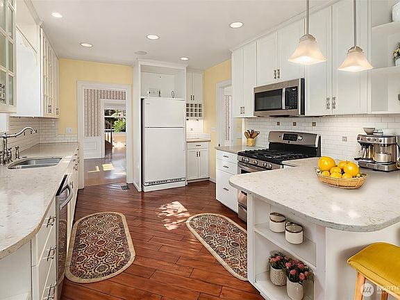 Eastlake Craftsman blends timeless charm with urban convenience. Nearly 3,000 sq. ft. of flexible living includes 4 bedrooms, 3 baths, plus 2 bonus attic rooms. A wisteria-draped porch leads to a living room with leaded glass windows, hardwoods, built-ins, and fireplace. Dining glows with southern light, the kitchen offers a cozy breakfast bar. Upstairs bedroom and bonus rooms capture territorial views, glimpses of Lake Union & Queen Anne, with a sunny deck. The lower level adds a bedroom, TV room, and workshop space. Outdoors: A private fenced patio oasis, mature greenery, with a rare two-car garage! Walk to tennis courts and Lake Union’s waterfront parks. Steps to Eastlake’s cafes and TOPS K-8. Zoned LR2 for future development potential.