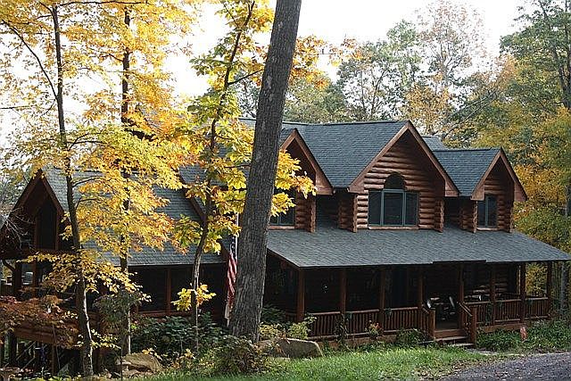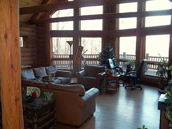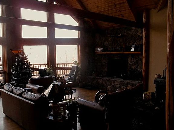 NEW PRICE! WILDERNESS LOG HOME on 20 Acres in Mosby Mountain Estates. Private wooded lot with views yet just 5 miles off Rt. 66. Spacious, bright & open great room has floor to ceiling windows & stone fireplace. 2nd fireplace & log wet bar in huge recreation room. Large wrap around deck with hot tub Main level master bedroom; Loft area has family room overlook. Wood floors and exposed logs.