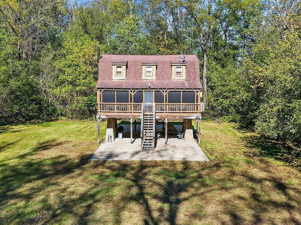 Escape to your own secluded retreat on over 4 acres of wooded privacy, perfect for recreation, a hunting getaway, fishing along the sand bar, or even a potential Airbnb opportunity. Located in Owen County, just over the Greene County line, this unique property is nestled between Fish Creek and the West Fork of the White River. From CR 990, enter through the gated drive and follow the long lane back to a private clearing where you’ll find the rustic river cabin, built in 2005. Offering 1,120 square feet, the open-concept layout includes a main-level living room, full bath, kitchen, and dining area, with a two-bedroom loft upstairs complete with closets. The cabin features tongue-and-groove wood walls and wide-plank flooring, creating a true cabin atmosphere. Multiple heating and cooling options include a wall-mounted gas heater, traditional wood stove, window air unit, and a newly installed mini split system. Enjoy peaceful evenings on the screened-in porch or park your vehicle beneath the cabin for protection from the elements. Additional features include a 50-amp camper hookup and a storage shed for your outdoor gear. (Note: Financing will require flood insurance on this property.)