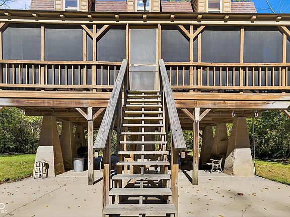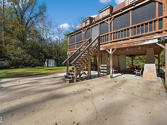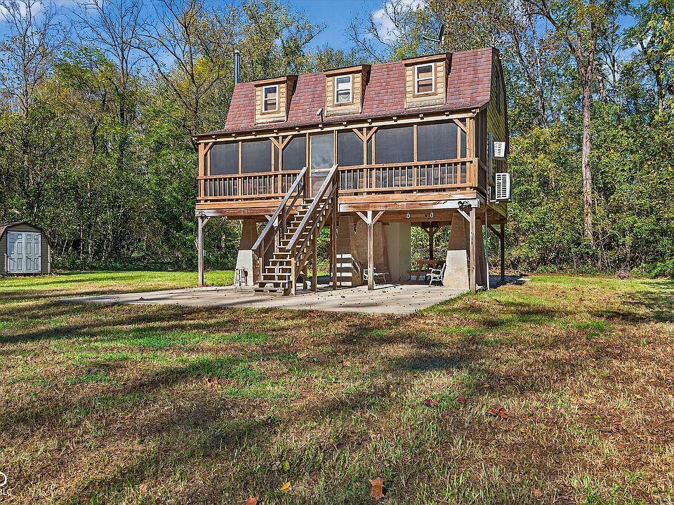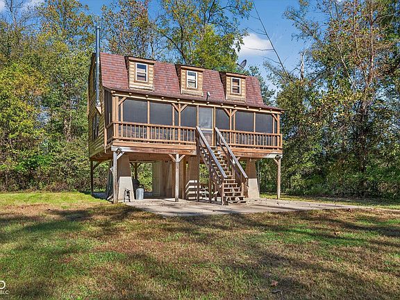 Escape to your own secluded retreat on over 4 acres of wooded privacy, perfect for recreation, a hunting getaway, fishing along the sand bar, or even a potential Airbnb opportunity. Located in Owen County, just over the Greene County line, this unique property is nestled between Fish Creek and the West Fork of the White River. From CR 990, enter through the gated drive and follow the long lane back to a private clearing where you'll find the rustic river cabin, built in 2005. Offering 1,120 square feet, the open-concept layout includes a main-level living room, full bath, kitchen, and dining area, with a two-bedroom loft upstairs complete with closets. The cabin features tongue-and-groove wood walls and wide-plank flooring, creating a true cabin atmosphere. Multiple heating and cooling options include a wall-mounted gas heater, traditional wood stove, window air unit, and a newly installed mini split system. Enjoy peaceful evenings on the screened-in porch or park your vehicle beneath the cabin for protection from the elements. Additional features include a 50-amp camper hookup and a storage shed for your outdoor gear. (Note: Financing will require flood insurance on this property.)