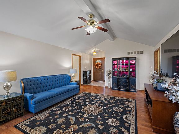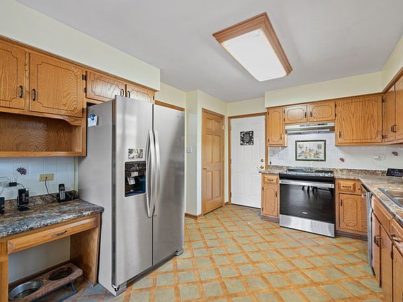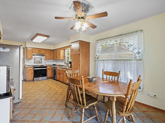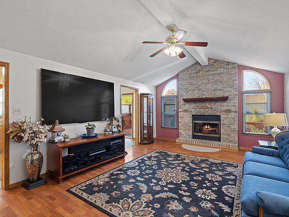 This well-kept 3-bedroom, 3-bath ranch blends comfortable living with great indoor-outdoor flow. A vaulted living room with a center beam is anchored by a floor-to-ceiling brick fireplace flanked by arched windows, while wood floors and ceiling fans continue through much of the main level. The spacious eat-in kitchen features extensive oak cabinetry, generous counter space, a tile backsplash with decorative accents, and stainless steel appliances; a sunny dining nook opens through a sliding glass door to an expansive deck with lattice privacy panels overlooking a fenced yard with a storage shed and a mature tree. The primary bedroom offers hardwood flooring and a private bath with a long vanity and step-in shower, and two additional bedrooms-one currently suited as a home office-are served by a full hall bath with a tub/shower combo. The finished basement expands your options with a large recreation/media area, a separate flex room, a full bath with a corner shower, a bright laundry/mechanical room, and a workshop/storage space. An attached 2-car garage, extended driveway, and a welcoming front walk with ramp complete the picture of a move-in-ready home with room to spread out inside and out.