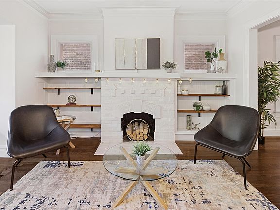 Classic white brick fireplaceSerene green tileRich hardwood floorsTree-lined blockIn-unit laundryCrown moldingSpacious back patio