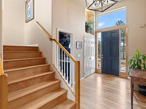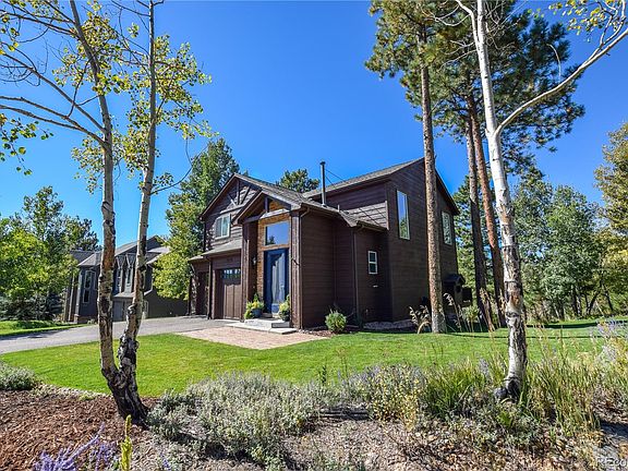 Located in the picturesque town of Evergreen, this beautiful home blends mountain tranquility with modern convenience. Offering sweeping views of Mt. Blue Sky, this gem features expansive windows in every room, an abundance of natural light, vaulted ceilings, and charming hardwood floors throughout. The open floor plan of the main level creates a seamless flow between the spacious great room, dining room, and kitchen — perfect for both entertaining and everyday living. The great room is anchored by a cozy gas log fireplace, offering a warm and inviting atmosphere. The updated kitchen is a chef’s dream, equipped with high-end JennAir and Bosch appliances, sleek concrete countertops, and an alluring breakfast nook with breathtaking views of the snow-capped mountain peaks. Adjacent to the kitchen is the laundry room and an attached 2-car garage, providing practicality and ease. Upstairs, the luxurious primary suite offers a private sanctuary with vast windows that capture the incredible mountain views. The recently remodeled 5-piece, ensuite bathroom is equipped with a spa tub and dreamy walk-in closet. Two additional bedrooms and a full bath round out the second floor, providing ample space for everyone. The bright, walk-out basement is a standout feature, offering a spacious living area complete with a wet bar, a second gas log fireplace, and a large 4th bedroom with full bathroom. Additionally, there’s a bonus space that can serve as an office, studio, or whatever suits your needs. Outside, the flat, lush side yard is beautifully landscaped with green grass, providing plenty of space for outdoor activities or simply enjoying the peaceful surroundings. With close proximity to local amenities, it strikes the perfect balance between mountain living and accessibility. This is truly a must-see home in Evergreen!