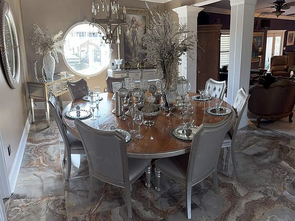 Ever dream of living on Marina Road? This single-story home offers comfort, convenience, and peace of mind. Unlike many waterfront properties, it has never flooded not during Frederick, Opal, Ivan, or Sally. No pilings, no steps, no stairs just easy living on one level. Enter through the 8ft door into an expansive foyer that opens to a separate dining room with porcelain tile flooring. The home includes 5 bedrooms and 2 full bathrooms, with the primary suite featuring large walk-in closet with built ins. Bath with Double Vanity, Clawfoot Tub. BA #2 has Custom Shower and Designer Sink. The heart of the home is a 37' x 16' great room, perfect for entertaining, with a custom bar, built-in ice maker, refrigerator, wet bar, and 16 feet of cabinetry designed around a Hooker Furniture wine cabinet. High-end appliances cooktop, GE Monogram and Café double-drawer dishwasher, double-drawer refrigerator, built-in oven, and microwave. High ceilings, ceiling fans, impact glass windows and doors. Abundant storage comfort and efficiency throughout The 1,400-square-foot attached garage is both air-conditioned & heated, accommodating three or more vehicles, golf cart storage, and more. A 10' x 12' bonus room serves as an office, man cave, or 6th bedroom. The garage includes wall of cabinets, automatic doors, side entrance. Outdoor living with a 41' x 15' covered porch, outdoor kitchen with built-in gas grill, refrigerator, wet bar, and ice maker. Two dining areas feature ceiling fans, lighting, and a fire pit. The saltwater pool w/tanning ledge, fireplace, conversation pit. The 80 feet of canal frontage on this 80' x 200' lot provides southern views, fenced backyard, irrigation system, and direct canal-front access with a private boat dock. This is Marina Road living at its finest—a thoughtfully designed residence combining luxury, practicality, and a true waterfront lifestyle. Generator Transfer Switch. Furnished with exclusions Buyer to verify all information.