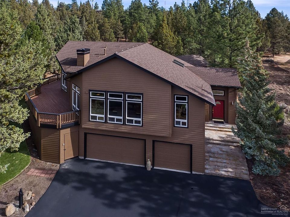 Custom one-owner home nestled into one of the largest lots (1.33 private acres) on top of Awbrey Butte. Home is almost all single-level with only garage and half-bath below. Open great room plan, walls of windows, newly added office, large third bedroom doubles as bonus room. Elevated deck flows from the living room, perfect for entertaining guests. A rare and private HOA-approved courtyard is fully-fenced to provide a protected retreat. Top of the line elevator system from garage to main level.