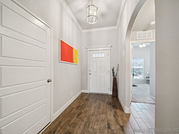 Welcome to Breitling Village, nestled near highway 75, lending easy access to all that Jenks and Glenpool have to offer! Enjoy this home in the Jenks Public Schools neighborhood with community walking trails and pool access. With full brick exterior, 4 bedrooms and 3 full bathrooms, the home offers excellent use of space. The open floor plan between the kitchen and living room is ideal for entertaining, with additional flex room available for use as a formal dining, office space, or activity room. A three car garage includes one bay with extra depth, allowing for storage, workbench or workout space. Just steps from the garage and front door is a built in drop zone, for additional organization of everyday items. Enjoy the large covered patio, offering tranquil views and sounds of the farmland located behind the house. Weather safety is a top priority with the professionally installed safe room, located in the primary suite. Call today!