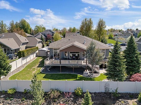 Luxurious custom home on 5-Mile featuring 10’ ceilings and sweeping views! Den or 2nd BR off entry with built-ins. Expansive great room with stone gas fireplace, custom cabinetry, surround sound and rich engineered hardwood floors. Striking iron railings and stair lighting add elegant detail. Gourmet kitchen showcases rustic hickory cabinetry, solid surface counters, a raised island, stone backsplash and a newer appliance package. Dining area with built-in hutch opens to the covered deck. Luxurious primary suite offers deck access, heated tile floors, dual vanities, California Closet system, a garden tub plus a tile shower. Main floor laundry. Daylight basement includes 3 BRs, full bath, gas fireplace, and wet bar. Plenty of room to entertain! Central vac, new HVAC, and high-end finishes throughout. Oversized 3-car garage with 12’ RV door, workshop area, utility sink, and gas line ready for a heater. Vinyl fence, RV pad, water feature, patio, concrete curbing and shed complete this exceptional dream home!