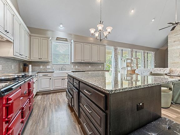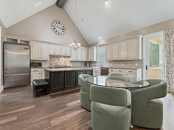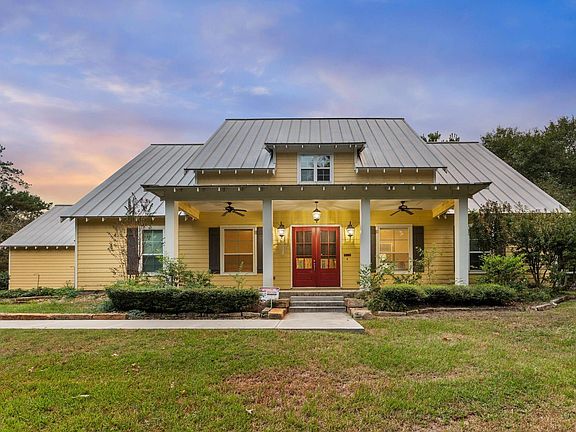 Welcome to this one-of-a-kind property that perfectly blends rustic charm with modern elegance. The bright yellow exterior, metal roof, and inviting red double doors create stunning curb appeal, while the expansive, private acreage offers peace and seclusion. Enjoy a serene pond with a private dock—ideal for relaxing or fishing. Inside, the open-concept layout features vaulted ceilings, wood-look flooring, and a striking stone fireplace. The gourmet kitchen is equipped with a granite island, stainless steel appliances, a Viking refrigerator, red range, and custom cabinetry. The primary suite offers a spa-like retreat with a soaking tub framed by stained-glass windows, a walk-in tiled shower, and dual granite vanities. A bonus room, laundry area, and half bath add convenience. Outdoors, the covered patio with ceiling fan and built-in grill is perfect for entertaining, complemented by a detached two-car garage currently used as a home gym.