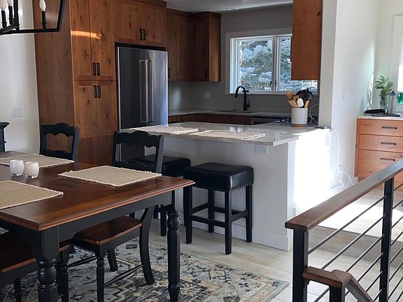 Available Sept 28, 2024 - May 31, 2025 (8 months). Luxury two bedroom 2 bath with office end-unit condo full of natural light on the ridge overlooking the Elkhorn valley to the south. Fully renovated, beautifully appointed and furnished condo within walking distance to Elkhorn village pool/hot tub and free Kart bus service. It is a two minute drive to Dollar Mountain, five minutes to the Sun Valley Resort Village, ten minutes to Ketchum and fifteen minutes to Bald Mtn. Enjoy the winter in Sun Valley in this cozy and fabulously located condo. When you enter this cozy home-away-from-home with luxurious wool carpet and stone tile flooring, you can leave all your gear at entry storage closet before heading upstairs to the cozy living room, dining room, kitchen, den/office area, and upper view deck. The living room is Top Notch furnished with a beautiful and plush down sectional and oversized chair with 60" smart tv and a gas fireplace that is thermostat controlled to providing heating throughout the upper level (no electric baseboards). The kitchen with new rustic alder cabinetry and single large stainless sink is complemented as a "best stocked" with with gas range and everything top quality that you'd want in your home for preparation of great meals and entertaining friends. The office area with desk, storage and blue tooth printer provides a great place to work remote or have your computer staged without disruption to other areas of the home. Head downstairs to the two bedrooms where the home comfortably sleeps 4 guests. The master has a comfy, firm mattress with king bed, dresser and double night stands, double closets and ensuite bathroom with walk-in shower, heated floors and private lower deck. The second bedroom has a plush queen bed and adjacent bathroom with heated floors and full sized, side-by-side washer and dryer. The unit flooring is insulated, bathrooms both have underfloor heating and beautiful wool carpets to keep you warm and cozy throughout the winter. Also, there is abundant and beautiful lighting fixtures and furnishings throughout. Deposit due at time of lease signing. Water, sewer, trash removal, and basic cable are included. In addition to montly rent, renters pay gas, electric, internet and upgraded cable if desired. No smoking no pets. Parking on site just in front of condo. Rental is available through May 31, 2025 (for 8 month lease) if interested.