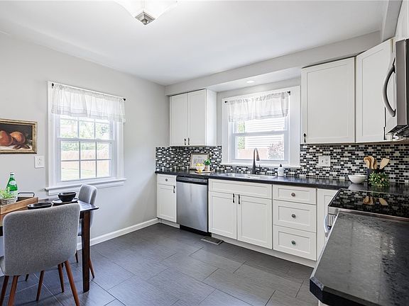 Welcome to 262 Barry Rd — a beautifully updated, move-in ready home in the heart of Irondequoit! This 3 bedroom, 2 FULL bathroom home features Canadian maple hardwood floors (2022), a newer architectural roof (2021), brand new vinyl windows throughout (including glass block in the basement 2022), and a newer central air system for year-round comfort. The updated kitchen offers modern appliances (all included), tile backsplash, new cabinetry and opens to a bright main living area filled with natural light. The home features two separate living rooms, connected by elegant glass French doors, with the main living room centered around a cozy modern wood-burning fireplace. The main bathroom has been fully updated with a tiled shower and new vanity. Upstairs offers spacious bedrooms, while the finished basement provides extra flexible space perfect for a home office, gym, playroom or man cave. Step outside to a fully fenced backyard on a rare OVERSIZED LOT complete with a large patio and extended cement driveway, and plenty of room for entertaining or future expansion. Additional updates include Trex decking front porch, complete interior painted (2025), 220V electric service in back yard and custom blinds throughout the home (included). This home checks all the boxes! Offers Due Tuesday June 24th by 12pm.