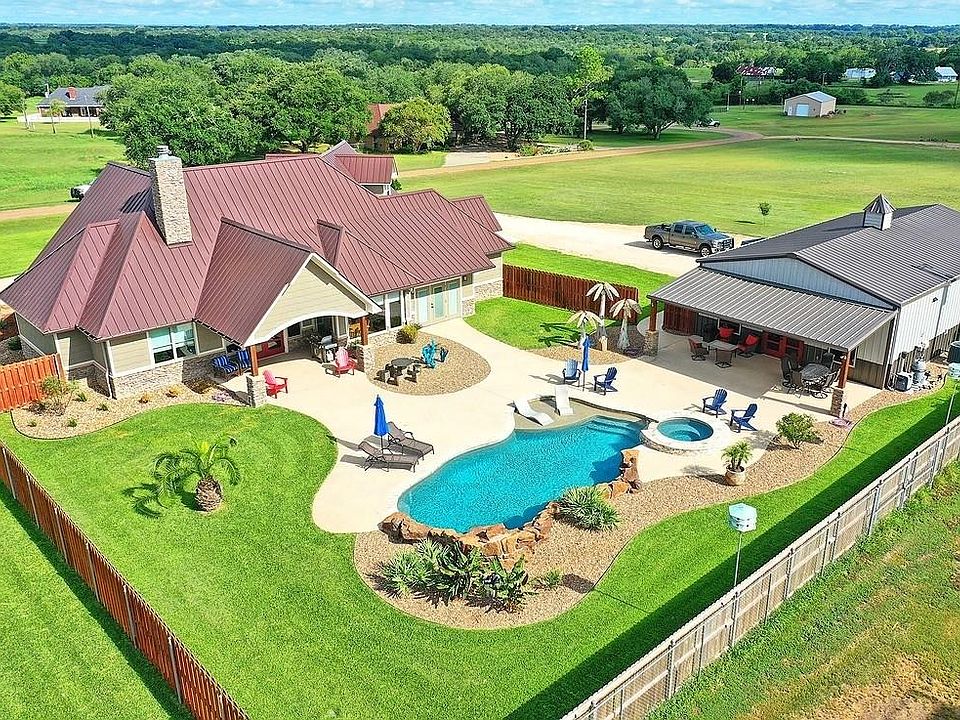 Impressive 2-acre retreat w/ custom 4BR/3.5BA home, pool & shop apartment. Stone-accented façade, standing-seam metal roof, lush landscaping & circle drive create standout curb appeal. Main Home (2,466 sq ft) – Vaulted family room with wood-burning fireplace & French doors to covered patio. Gourmet kitchen with island prep sink, granite & Frigidaire Professional fridge. Private primary suite offers pool access, copper soaking tub, dual vanities & walk-in shower. Two guest rooms share a full bath; upstairs suite has its own bath & walk-in closet. Sunlit office, oversized laundry, and half bath off 2-car garage. Outdoor Oasis – Sparkling pool & hot tub with rock waterfall, expansive covered patio, full irrigation. 30×50 Shop & 1BR/1BA Apartment – Two overhead doors, full kitchen, pool table, porch, plus lean-to for equipment.