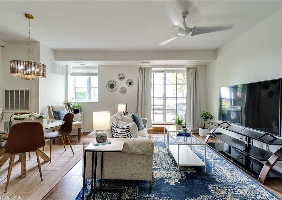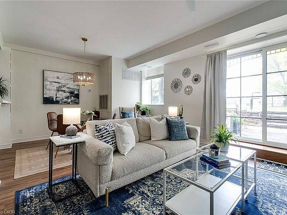 Welcome to this bright and beautifully updated 1-bedroom condo with 2 parking spots located in the sought-after Olde Waterdown Highschool building. Offering 885 sq ft of spacious, carpet-free living, this ground floor unit combines modern comfort with unbeatable convenience. Enjoy 9-foot ceilings, an open-concept living and dining area, and large windows that flood the space with natural light. The updated kitchen features sleek new countertops, a subway tile backsplash, modern cabinetry, and a breakfast island perfect for casual dining or entertaining. Freshly painted throughout with new light fixtures, the unit feels fresh, clean, and move-in ready. Step through the sliding doors to your own covered patio ideal for morning coffee or afternoon BBQs. The generously sized bedroom offers a large window and a modern light fixture, while the 4-piece bathroom is clean and functional. Additional highlights include 2 underground parking spaces (a huge bonus in the winter!) and a storage locker for added convenience. Situated on the main floor, this unit makes everyday living easier whether it's bringing in groceries or welcoming guests. The well-maintained building offers great amenities including a party room and games room, along with lovely landscaped curb appeal. All of this within walking distance to downtown Waterdown, where you can explore charming cafes, a local theatre, restaurants, patios, and shops. You're also just minutes from grocery stores, banks, parks, and all other key amenities. Whether you're a first-time buyer, downsizer, or simply looking for easy condo living in a fantastic community - this unit checks all the boxes.