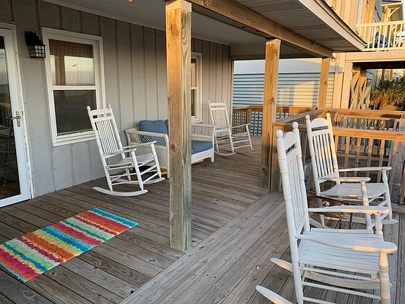 Oceanfront cottage with a private walkway just steps to the beach. Home has up-to-date features with granite countertops, stainless appliances, new mattresses and comforters, ceiling fans and TVs in all rooms. Home has been updated and wood floors throughout. The outdoor shower is perfect after a day spent on the beach. There is plenty of room to play cornhole or any other beach games under the house or in the driveway. 5+ covered parking spots, plus 6 additional in the driveway. This is a perfect getaway in OIB. (Sleeping: 1 King, 1 Full + 1 twin, 1 Queen, 4 twins (bunks)). Washer/dryer on-site