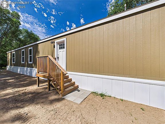 Welcome to a beautifully finished, brand-new single-wide home in the Pueblo West manufactured home community, where you own both the home and the land—no lot rent or HOA! Step inside to discover an open-concept layout filled with natural light, featuring wood-look flooring throughout and a stylish modern color palette. The spacious living area flows seamlessly into a contemporary kitchen with stainless steel appliances, a large island with pendant lighting, and ample cabinetry. The primary suite includes a walk-in closet and a private bathroom with dual sinks and a glass-door shower. Two additional bedrooms, a full bath, and a separate laundry room with exterior access offer everyday convenience. Central A/C keeps the home comfortable year-round. Outside, enjoy low-maintenance front xeriscaping and a newly installed rear fence for added privacy and utility. Set on a large, open lot with room to personalize, this move-in-ready home offers a rare chance to own affordably in a growing area.