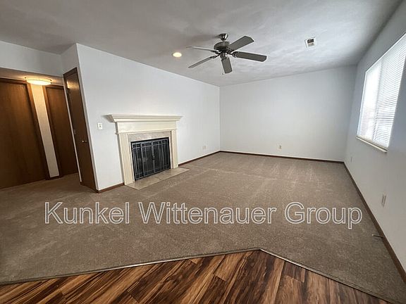 Two-bedroom, one-bath ground-level condo with new carpet throughout. Features a spacious living room with a wood-burning fireplace and an eat-in kitchen equipped with a stove, refrigerator, dishwasher, and microwave. The full bathroom includes a stacked washer and dryer. One bedroom offers a sliding door to the patio, which includes a large storage closet. The bedroom closet features double-hung rods with ample hanging and shelf space. Located in Eagle Ridge with convenient access to parks, schools, hospitals, and shopping. Community pool included, along with lawn care and snow removal. Pet negotiable under 25 lbs, subject to pet screening.