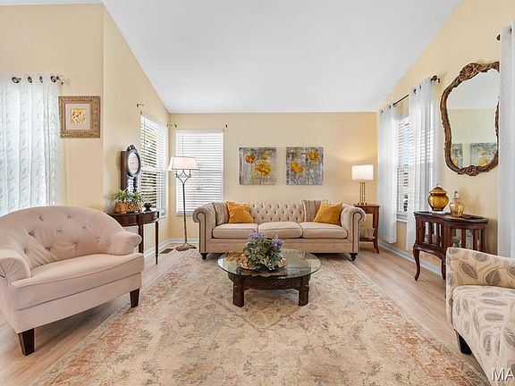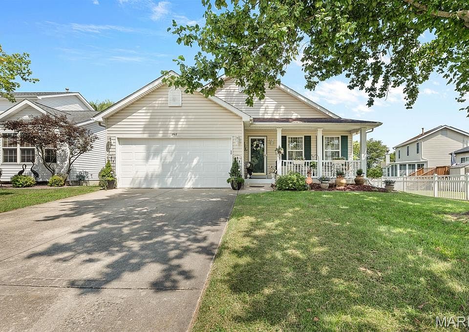 Welcome to this charming 3 bedroom, 3 bathroom home spanning over 2,000 square feet. This residence offers a blend of comfort, style, and functionality. Step inside to be greeted by soaring vaulted ceilings that grace the open-concept living areas filling the space with natural light and modern living. The kitchen with laundry closet seamlessly connects to both dining and living rooms creating an ideal setting for entertaining and gatherings. The primary suite serves as a retreat with an en-suite bathroom. The additional two bedrooms provide versatile space for family or guests. The finished lower level adds significant value and is complete with a flex room, another bathroom, and a cozy family room with built-in shelving. Tucked away under the basement stairs behind the bookshelf, you'll find a unique feature: a safe room. The dry bar is a perfect addition for game nights or unwinding after a long day. Step outside to your private backyard where the covered patio overlooks a meticulously maintained flower garden. This tranquil space offers peaceful mornings with a cup of coffee or festive summer barbecues. Neighborhood residents enjoy exclusive access to a neighborhood pool and scenic walking trail promoting an active and connected community atmosphere. Close to SAFB, shopping, restaurants and within 30 minutes of downtown St Louis. Preapproved buyers please and buyers to verify all information prior to making an offer. Sellers prefer to close the week of October 27-29.