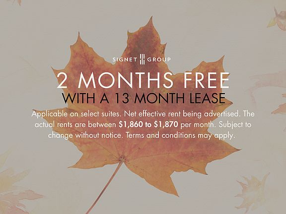 - Special offer! *Limited Time Offer: Get 2 Months Free with a 13 Month Lease! - Net effective rent being advertised. The actual rents are between $1,860 to $,1870/month. Promotional offer is based on a 13-month lease with 2 months free. Subject to change without notice. Terms and conditions may apply. Schedule a tour to learn more.