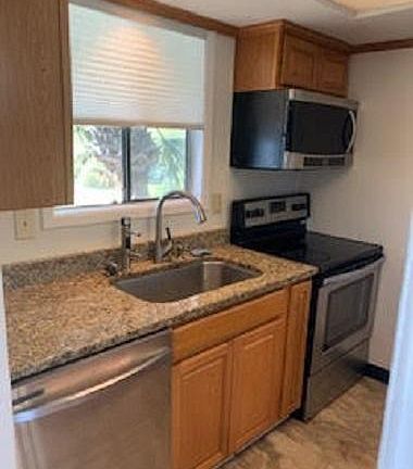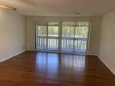 Kitchen area offers stainless appliances and a breakfast bar. Living area has wood flooring and double glass sliding doors.