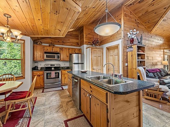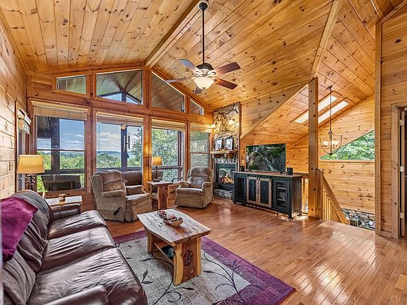 Located just minutes from Downtown Blue Ridge, this charming cabin offers stunning year-round mountain views and is priced affordably, making it the perfect escape or investment opportunity. Meticulously maintained by the current homeowner, this cabin is ready for you to move in and start enjoying your mountain getaway without any hassle. Boasting three en suites, this property is an ideal choice for larger families or as a lucrative short-term rental. The moment you step inside, you'll be captivated by the breathtaking mountain views flooding in through a grande wall of windows. The open floor plan creates a warm and inviting space, perfect for entertaining family and friends. On the main level, you'll find a thoughtfully designed split bedroom layout featuring two cozy bedrooms and a versatile office/bonus space adorned with beautiful rock walls that add rustic charm. Make your way to the spacious lower-level bedroom, complete with a delightful corner fireplace, providing a perfect spot for relaxation and its own screened-in porch for private outdoor enjoyment. Venture outside to the expansive upper-level deck, also screened-in, allowing you to soak in the remarkable views while being shielded from pesky bugs. The beautifully landscaped surroundings offer exceptional curb appeal, enhancing the cabin's charm. With ample parking provided by a circular driveway and a one-car garage, convenience is key. Located in a thriving short-term rental community, this property opens up a world of possibilities for rental income or personal enjoyment. Whether you seek a peaceful retreat, a family gathering place, or an investment property, this mountain cabin has it all. Annual $800 dues covers community water, dumpster & road maintenance. Roads are maintained every 4-6 weeks!