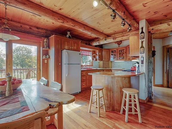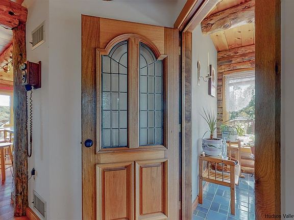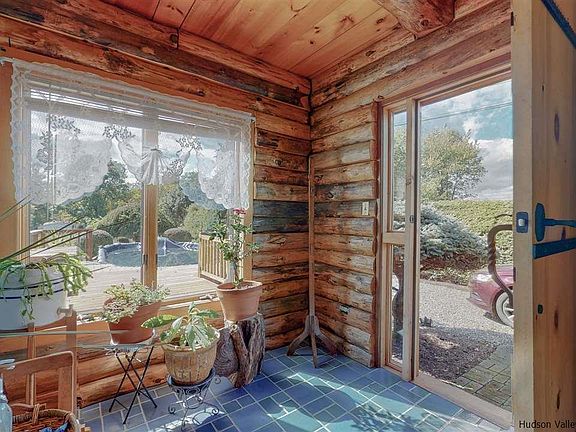 Expertly crafted by hand, this log home is a must-see for anyone wanting a peaceful hideaway nestled amongst the trees. This is a warm and inviting home that offers an idyllic sanctuary on cold winter nights as well as the perfect base for summertime hiking and adventure. No detail has been overlooked in the creation of this stunning Log home from the screwed and pegged oak flooring to the exposed beam ceilings and the orientation of the deck that ensures sweeping mountain views. Set in the heart of the home is a beautiful double-sided Bluestone fireplace that warms both the living room and the kitchen and dining area. Multiple double doors open out to the expansive deck while the open-plan kitchen features custom cherry cabinets and a suite of appliances. There are three bedrooms and two full baths spread throughout the two levels of living. The owner's suite is housed upstairs, warmed by a fireplace and with access to a loft-style office and a bathroom with mountain views. Extra features abound such as the oak doors throughout including the closet doors, a full attic that is insulated and ready to be finished, plus central air-conditioning. There is a huge basement with a large garage with room for 4-wheelers, a boat, camper and more, plus there is a one-car garage on the main level. This immaculate hand-crafted home is surrounded by beautiful gardens and there is a new aboveground pool ready for endless hours of summertime fun. Established bushes provide privacy from the road so you can feel like the only person for miles Conveniently located in the Town of Ulster, and in the Saugerties School District. Minutes to Kingston, NYS Thruway, Saugerties Village and Rhinecliff Train Station.