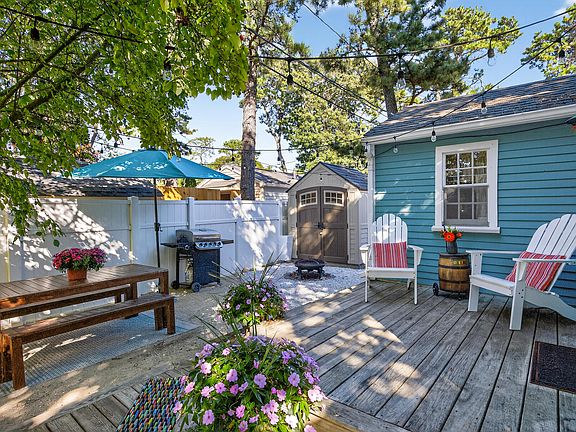Beyond the bright sunny yellow Dutch door awaits a nostalgic retreat with knotty pine walls, vaulted ceiling, and all the character of yesteryear. Charming one-bedroom, one-bath cottage with deeded beach rights, just a five-minute walk to a private beach. Enjoy the covered outdoor shower tucked beneath the trees, accessible directly from inside the cottage. Gather around the fire pit or dine under twinkling string lights at the picnic table beneath the dogwood tree. A small deck and picket-fenced front yard create just the right amount of outdoor space to relax and entertain. Large Shed. Being sold turn-key, this ''cute-as-a-button'' cottage offers the quintessential Cape Cod lifestyle in the welcoming culture of Salt Air Village.The HOA features a full-sized basketball and volleyball courts, a ball field that hosts summer lawn movies, a fishing pond, shuffleboard, horseshoes, and winding paths for a leisurely stroll. Generations of families return year after year, drawn to the nostalgia, community spirit, and carefree Cape Cod summers. Seasonal use from April 15-October 15. Not on leased land.