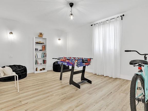 Spacious backyardFlat ceilingsVersatile denEat-in barSeating areaFire pitSleek black-and-white design