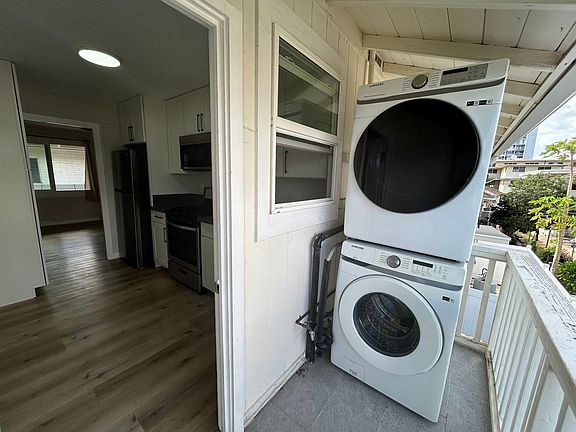 This is a must see, secured fully renovated unit. It is two-bedroom, one-bathroom and comes with one parking stall. This unit is located on the second floor of the two story back building. It comes with a full sized washer/dryer and a small lanai.