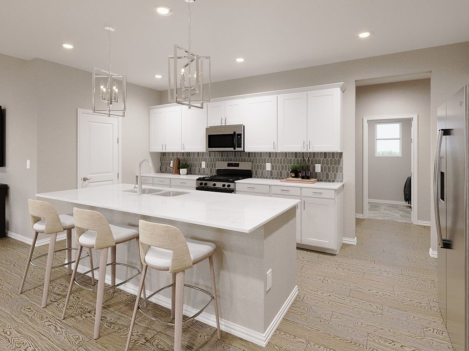 Dark beige tweed carpetTan tone evp flooringUseful islandSoccer fieldsPickleball courtsImpressive kitchenLarge pantry