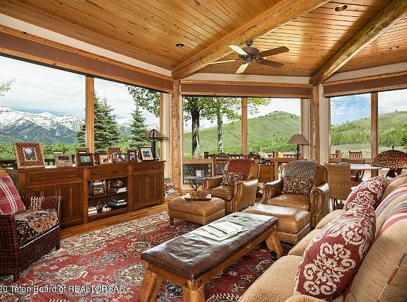 Set on 3.94 acres, bordering the conservation-preserved Walton Ranch & State of WY land beyond, this 4,812.4 sq ft 5 br, 4.5 ba home brings together privacy, nature & charm. Abundant windows offer natural light. Perfect for entertaining friends and family, the outdoors features a fire pit, hot tub and a gravel court well suited to a game of bocce ball or horseshoes. The multilevel home favors excellent separation of space. The main living spaces look out onto the beautiful scenery & provide a quaint, comfortable interior around a wood burning fireplace. 3 guest bedrooms share a floor with 2 full bathrooms, while a master bedroom suite & office occupy separate floors. The downstairs hosts a guest suite & full bathroom with outdoor access. The 2 car attached garage offers a workbench & sink