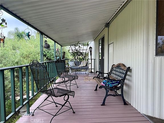 In a desirable 55+ community under rent control and nestled on a large corner lot is this move in ready 2 bedroom 2 bath home. On first look you have the inviting front porch giving access to the home by the front door or a sliding door.  The sliding door makes entertaining easy between the kitchen, dining room and porch.  The kitchen has a pass-through window with counter seating on the dining room side. The front door lets you into the spacious living room.  There is plenty of storage inside with a broom closet and pantry for the kitchen and a coat closet near the front door.  The primary suite has 2 large closets.  The secondary bedroom has direct access to the guest bathroom.  There is new flooring and fresh paint as well as a new refrigerator and stove.  The water heater is less than 2 years old and the metal roof has a lifetime warranty.  The HVAC is less than 10 years old and there's earthquake bracing. The 3 sheds, 1 with electricity,  the driveway's easy access due to the extended carport supports and the mature landscaping on sprinkler timer add to the appeal of this home.  Come enjoy all this home has to offer!