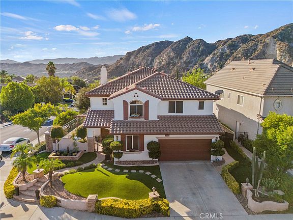 Stunning corner lot for this Updated Stevenson Ranch home. This 5 bedroom 4 full bath home has some of the best views Stevenson Ranch has to offer! You will first notice the charm of the gated front patio with fountain to enjoy your morning coffee or evening glass of wine! As you enter the oversized beautiful wood front door you are welcomed by tall ceilings and tons of natural light. With a full bedroom and bath downstairs, a Hollywood suite and ensuite bedroom along with the oversized Primary suite upstairs there is plenty of room and privacy for everyone. Beautifully upgraded porcelain wood like floors, kitchen with custom granite countertop and backsplash, opens to the stacked stone fireplace and family room all with complete privacy and mountain views. Outside there is a built in BBQ area, concrete bench and fire pit next to the Spa and sparkling pool making the backyard an entertainer's dream. This home also has PAID solar panels and drought tolerant lanscaping keeping the maintence cost low and the value high. You will not be disappointed by this gorgeous property!