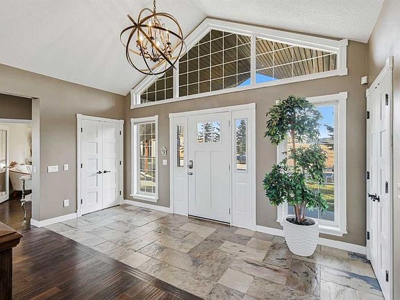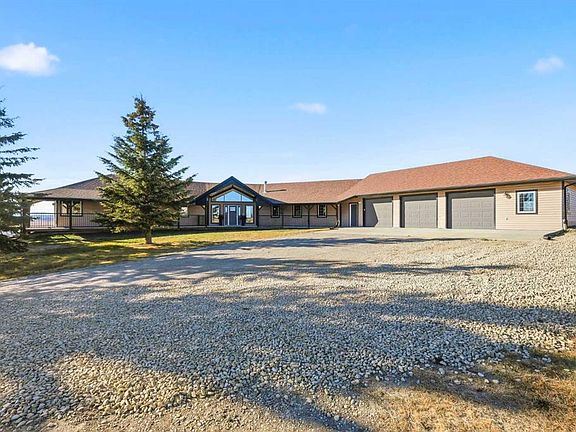 This stunning 4.41-acre property presents an exceptional opportunity to own a picturesque parcel of land with sweeping mountain views and a beautifully designed walkout bungalow. Nestled at the end of a serene, tree-lined drive, the home exudes timeless country charm with its sprawling layout, expansive wrap-around deck, and triple car garage — perfectly combining peaceful rural living with the convenience of being just minutes from Cochrane. Step inside the large front foyer, where vaulted ceilings immediately impress. The living room is a showpiece, centered around a dramatic floor-to-ceiling stone fireplace, with windows perfectly framing the breathtaking Rocky Mountain views. The spacious dining room is ideal for entertaining family and friends, offering ample space for large gatherings while enjoying the open-concept flow and natural light throughout. The chef-inspired kitchen is a standout, featuring a Wolf gas stove, Sub-Zero fridge, dual dishwashers, custom range hood, pot filler, and expansive granite countertops — perfect for both cooking and entertaining. A convenient office just off the kitchen provides a quiet workspace or flexible area. The primary suite is a tranquil retreat with spacious walk-in closets complete with organizers and private access to the west-facing deck. The ensuite bathroom is luxurious and spa-like, with double sinks, granite countertops, a large soaker tub, and a favorite feature of the current owners — an incredible steam shower. Two additional bedrooms and a full bathroom complete this wing of the home. The mudroom is highly functional, offering a half bath, laundry room with sink, and plenty of cabinetry and storage space. The attached triple garage is set up for both workshop and parking needs and is roughed in for in-floor heating and a future sink. Downstairs, the walkout basement continues to impress with a gas fireplace that anchors the space and creates a welcoming atmosphere. The expansive recreation area offers endless options — from a home gym to games or family entertaining space — all finished with durable slate flooring. The family room is perfect for movie nights or cozy evenings in. Two additional bedrooms and a full bathroom complete the lower level. Step outside to the covered patio with beautifully finished exposed aggregate concrete off the lower walkout — a generous outdoor space with room for a hot tub, sauna, or your dream outdoor living setup, all while enjoying awe-inspiring views! This home has seen thoughtful upgrades, including a new roof (2022), full replacement of poly-B plumbing, a water filtration system, a new electrical panel, a new concrete garage floor with rough-in for in-floor heating, a utility sink and a new concrete driveway apron. This exceptional property, complete with a barn, room for animals, and stunning mountain vistas, balances timeless country allure with comfort, functionality, and the perfect setting for family life. Schedule your private tour today!