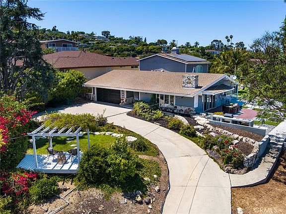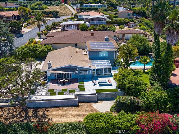Gorgeous estate size view property in Rancho Palos Verdes. The 28,000 sq. ft. lot is nearly 100% usable with spectacular views from the Hollywood sign to the ocean. The 4 bedroom home was meticulously remodeled in 2000. The designer home has a circular driveway, the custom door opens to an open floor plan with family room and fireplace. The kitchen enjoys custom cabinets, new stone counters, stainless appliances and a center Island. The master retreat offers a sitting area with dual-sided fireplace into the lavish granite master bath with spa tub and separate shower. The huge 9' x 11' oak floored walk-in closet is also a spacious dressing room. New wide plank maple floors, and a private balcony take in incredible views. Two additional bathrooms have designer touches. Enjoy little to no electrical bills with the state of the art solar system. The lushly landscaped rear yard has a pool and separate spa, fireplace and numerous sitting areas, and a large deck to take in the views of the city and ocean. Numerous mature fruit trees adorn the grounds including avocado, orange, lemon, grape fruit, and pomegranate. Owner recently installed new flooring and freshly painted the home. This home is in the award winning Palos Verdes School District.